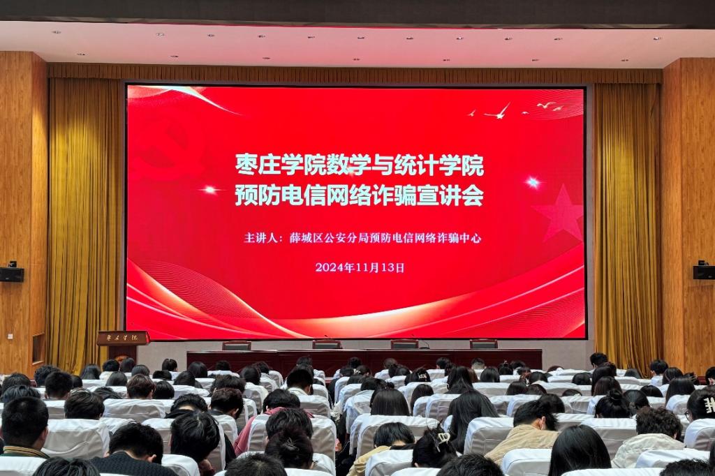 为提高学生安全防范意识,保障广大同学财产安全,永利23411集团于11月13日在崇德楼报告厅级举行了“电信网络诈骗防范宣讲会”。本次活动邀请了薛城公安分局反诈中心、沙沟派出所及驻校警务室民警,2023、2024级学生参加了宣讲会。