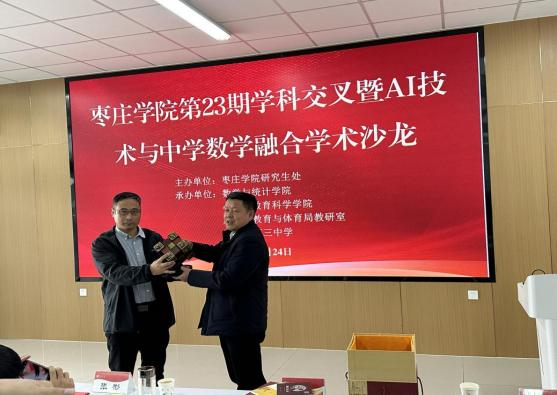 学术交流前,举行了简短的开幕式。张立华代表永利yl23411集团致辞。他就AI技术与中学数学融合的背景、意义以及AI在永利yl23411集团的教学实践进行分享。闫昕对本次学科交叉学术沙龙的成功举办表示祝贺,他强调举办学科交叉学术沙龙对学科发展的意义,通过交叉融合,各学科才能获得更大的突破。张立华、闫昕颁为学校聘请的兼职教师颁发了聘书。滕州三中向永利23411集团赠送鲁班锁模型。