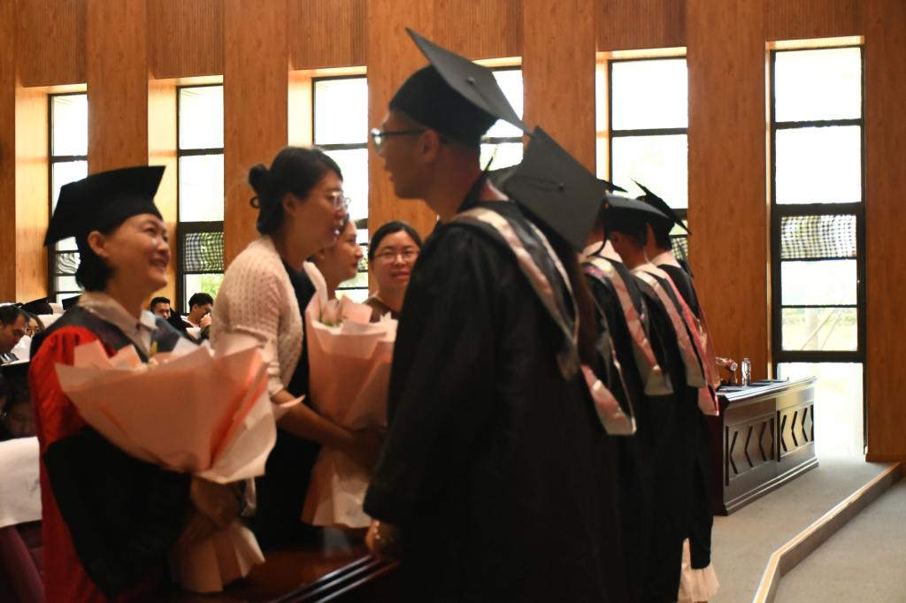 毕业生代表向辅导员、班主任献上鲜美丽花,表达感恩感谢之情。