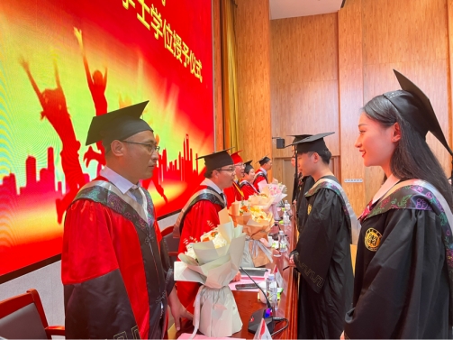 典礼在庄严的国歌声中拉开了序幕。首先,永利23411集团副院长吕长青宣读授予学士学位决定暨获得学士学位学生名单并对毕业生顺利毕业表示祝贺。随后,永利yl23411集团党委委员、副校长丰雷为本科毕业生拨穗正冠、授予学士学位,为学生们颁发毕业证书并握手合影留念。