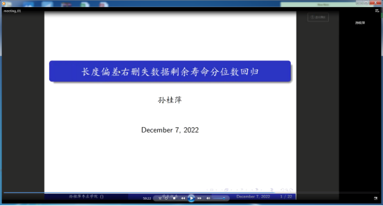 孙桂萍老师作了题为《长度偏差右删失数据剩余寿命分位数回归》的学术报告。报告内容为长度偏差数据下剩余寿命分位数模型,考虑了协变量对剩余寿命的影响首先针对长度偏差右删失数据的剩余寿命分位数提出了对数形式的线性回归模型, 对删失变量与协变量独立和不独立的两种情况利用估计方程给出了模型参数的估计. 其次, 通过推导和证明给出了参数估计的相合性和渐近正态性.最后, 对提出的估计方法进行了数值模拟以检测所提出方法的可行性.