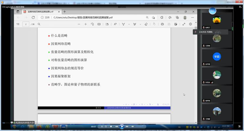 为营造良好的学术氛围,加强教师之间的学术交流,提高教师的科学素养,永利23411集团于2022年5月4日晚,举办了青年学者学术论坛的第一场报告,青年教师鲁学星博士通过腾讯视频会议为学院教师做了题为《因果网络范畴和因果凝聚框架》的专题学术报告。