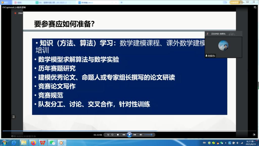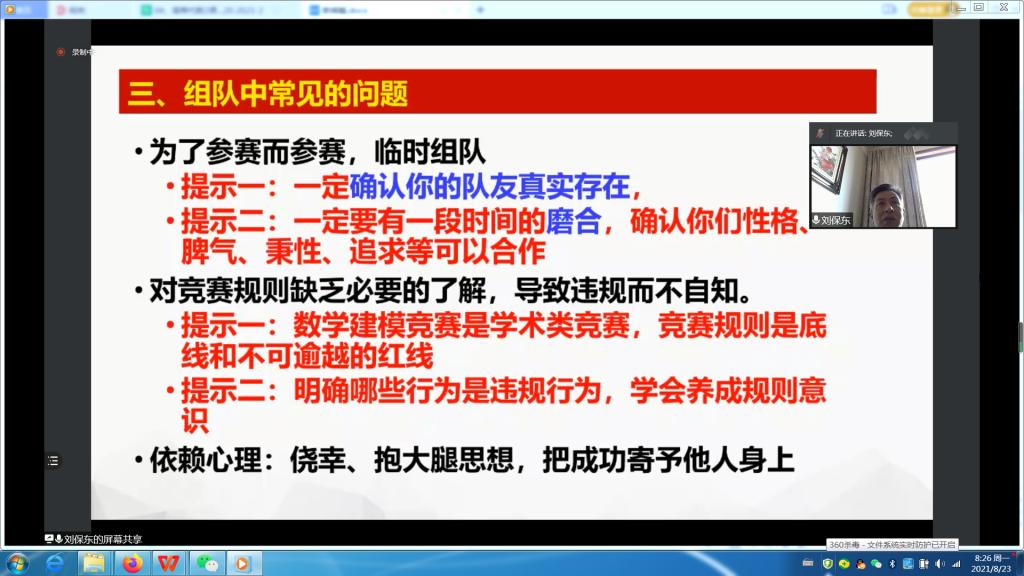 刘教授的报告有高度、有深度、有广度、有温度,学理性强,趣味性足,思维宏阔,发人深省,刘教授从全国大学生数学建模竞赛的组队开始讲起,详细的介绍了从注册报名到竞赛结束的整个过程,并且重点介绍了比赛过程中如何分析题目以及如何查阅相关的知识点。