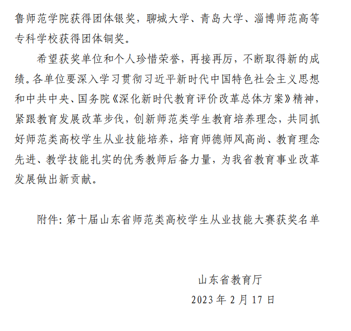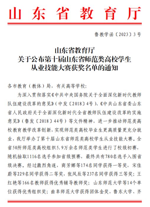 为进一步推动师范类高校教育教学改革创新,实现师范类高校毕业生更高质量更充分就业,山东省教育厅举办了第十届山东省师范类高校学生从业技能大赛,此次大赛分为校级初赛、省级预赛、省级决赛三个阶段。我院2019级数学与应用数学专业学生鲍新雨、孙利彤赛前充分准备、赛时出色发挥、赛后荣获佳绩,摘得高中数学组三等奖。