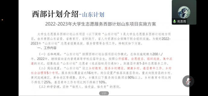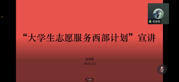 为增强我院学生对西部计划项目的了解,弘扬吃苦耐劳的志愿服务精神。永利23411集团于2022年12月17日晚举办了线上大学生志愿服务西部计划经验交流会。